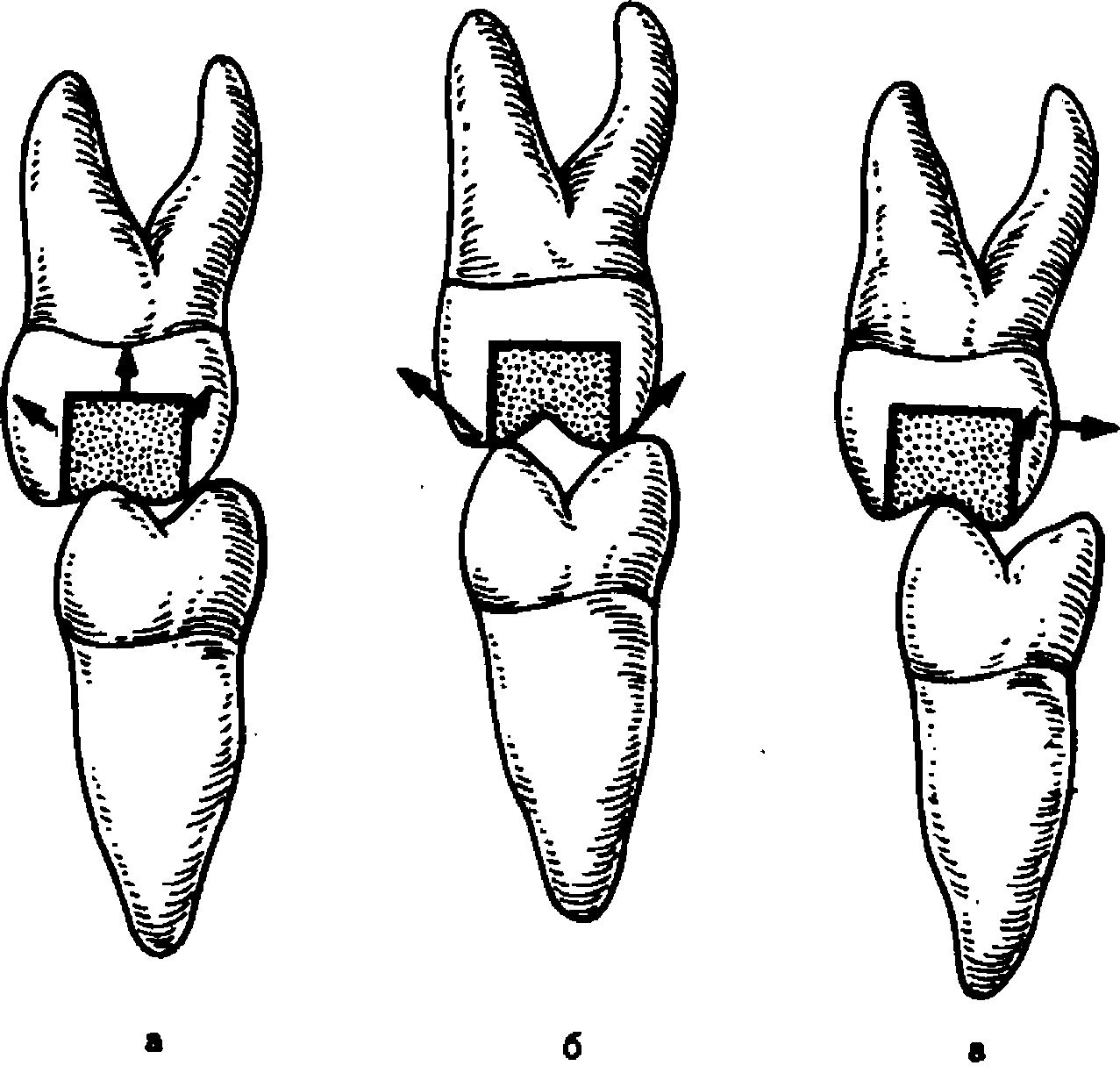 Сопротивление горизонтальным силам, действующим на вкладку, оказывают вертикально расположенные стенки основной н дополнительной полостей, причем наибольшее — стенки, сформированные параллельно оси зуба. Косо направленные стенки создают наклонные плоскости, по которым вкладка может выскользнуть из полости и отколоть часть стенки. Горизонтально направленные силы действуют на вкладку в четырех направлениях — вестибулярно, лингвально, медиально н дистально.