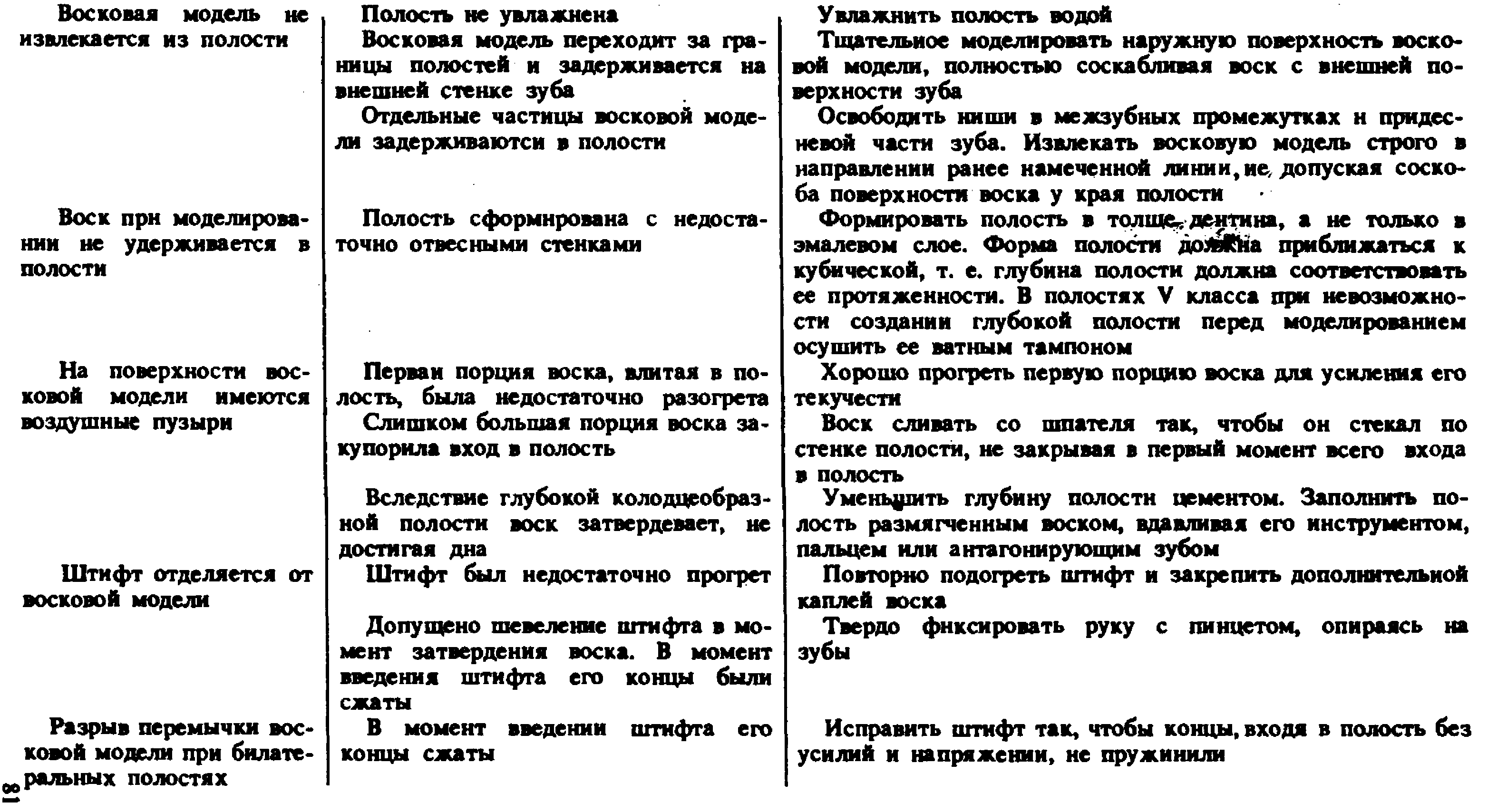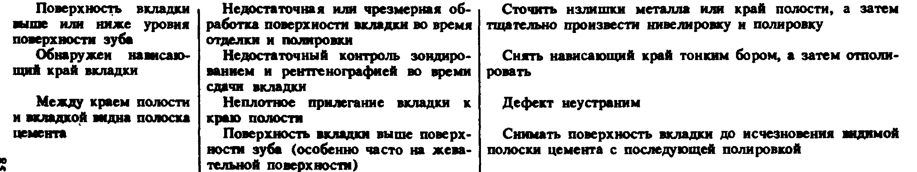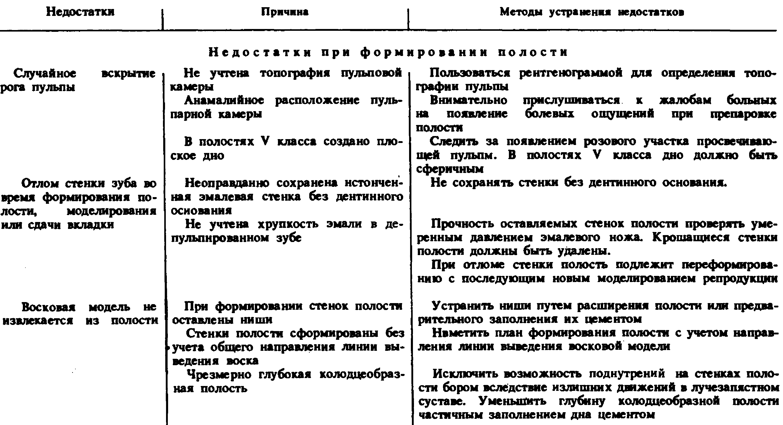 Таблица 2. Недостатки при изготовлении литых вкладок, их причины и методы устранения (по Алыоицу)