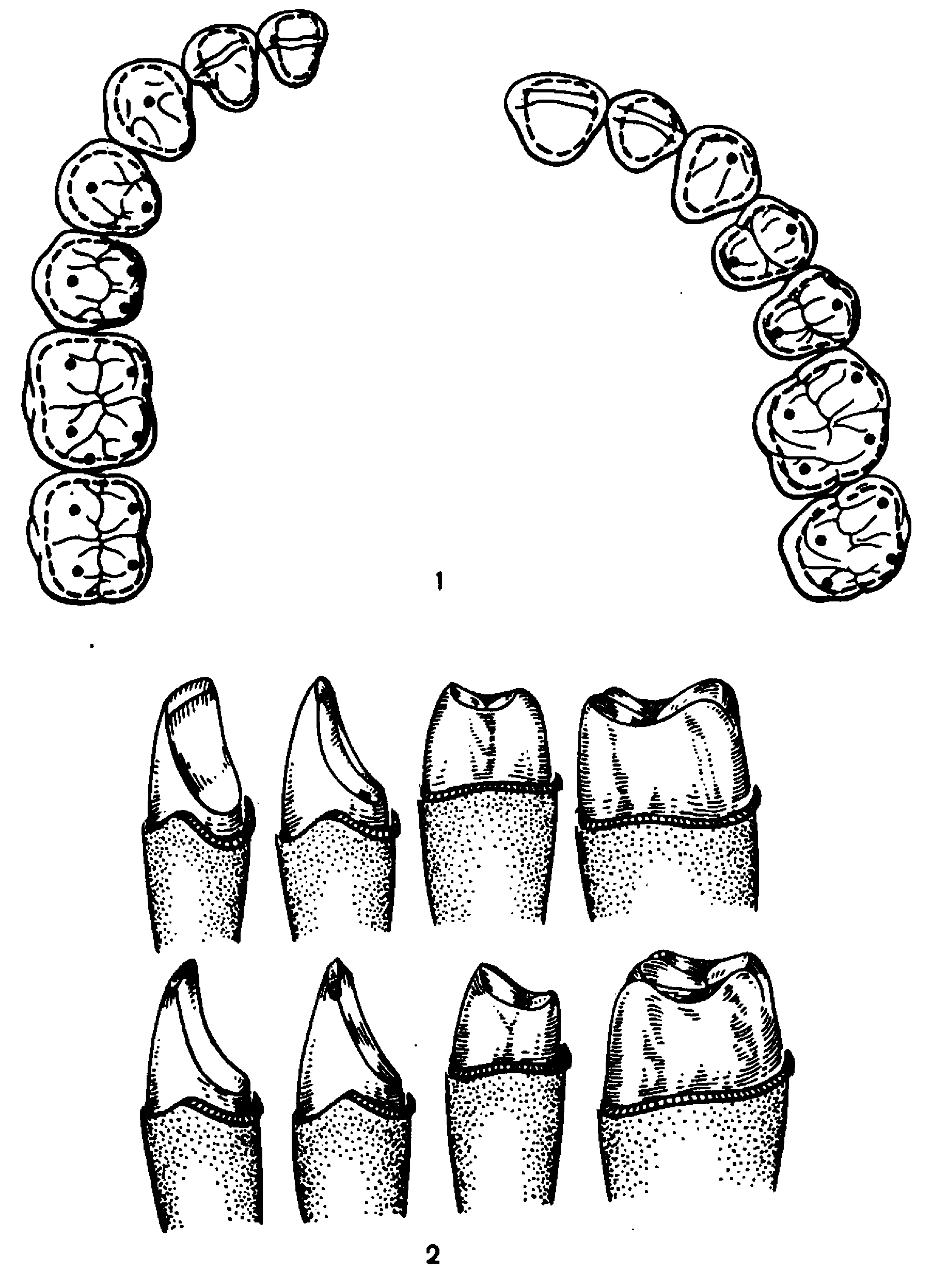 Рис. 12. Контуры клинической шейки зуба (1) и форма коронок зубов после препарирования (2), определяющие качественные показатели.