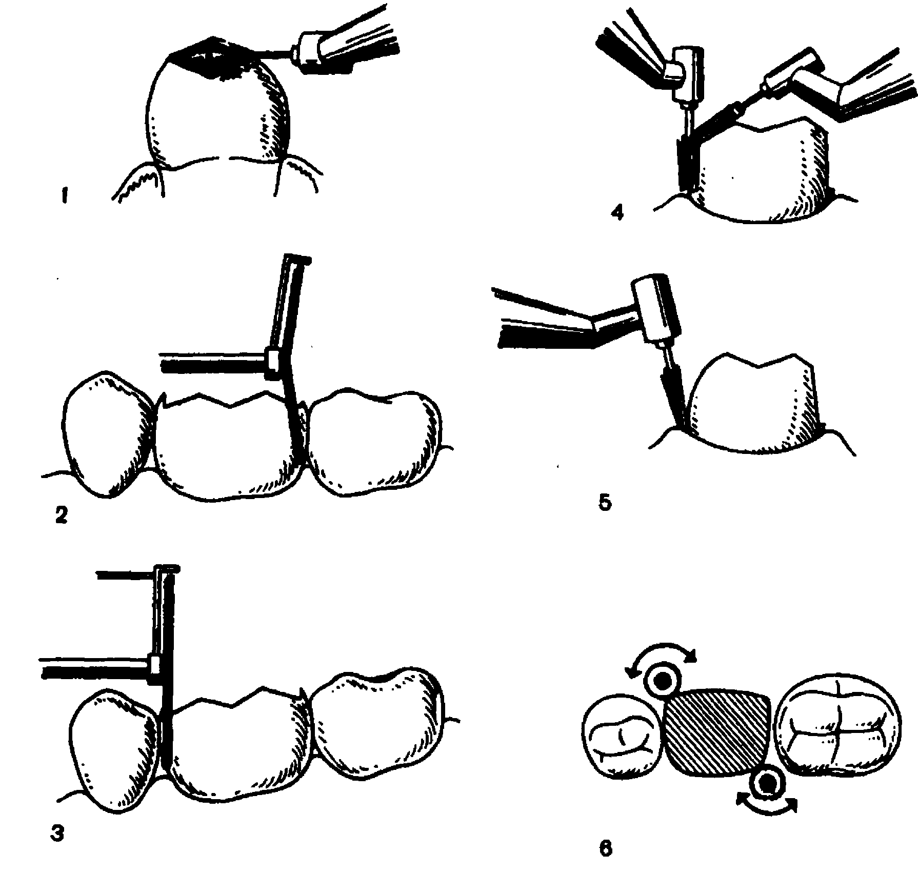 Рис. 13. Положение диска и фасонных головок при правильной препаровке апроксимальных поверхностей. 1 —6 — моменты препаровки.