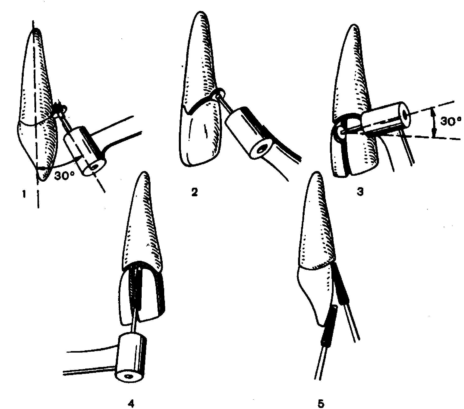В горизонтальной плоскости дно полости можно сформировать перпендикулярно длинной оси зуба на режущем крае и в пришеечной части аппроксимальных сторон. Специфика оперативной техники препарирования фронтальных зубов для восстановления вкладками заключается в формировании вертикальных стенок и дна полости с учетом не только перераспределения всех компонентов жевательного давления (ведущим является угловой компонент), но и путей введения вкладки. Различают два пути: вертикальный со стороны режущего края и горизонтальный с оральной стороны кпереди.