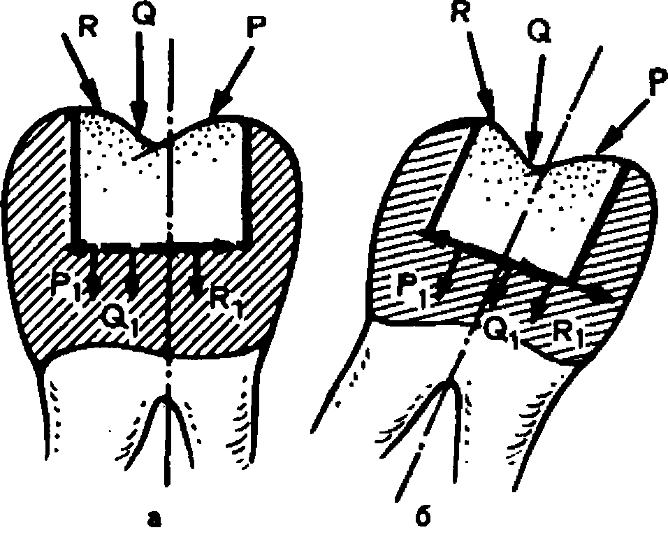 Задача оперативной техники — формирование полости, дно которой перпендикулярно длинной оси зуба (определяют направление наклона), а стенки параллельны этой оси и перпендикулярны дну. Если наклон в вестибулярную сторону для верхних жевательных зубов и в оральную для нижних более 10—15°, а толщина стенки незначительна (менее половины расстояния от фиссуры до вестибулярной — оральной поверхности), то правило формирования дна изменяется: оно должно иметь, наклон в противоположную от наклона зуба сторону. Это требование обусловлено тем, что окклюзнонные силы, направленные на пломбу или вкладку под углом и даже вертикально, оказывают смещающее действие и могут способствовать отколу стенки зуба. Следовательно, формирование полости косо в сторону от истонченных стенок, малоустойчивых механическому воздействию сил, предупреждает их откол.