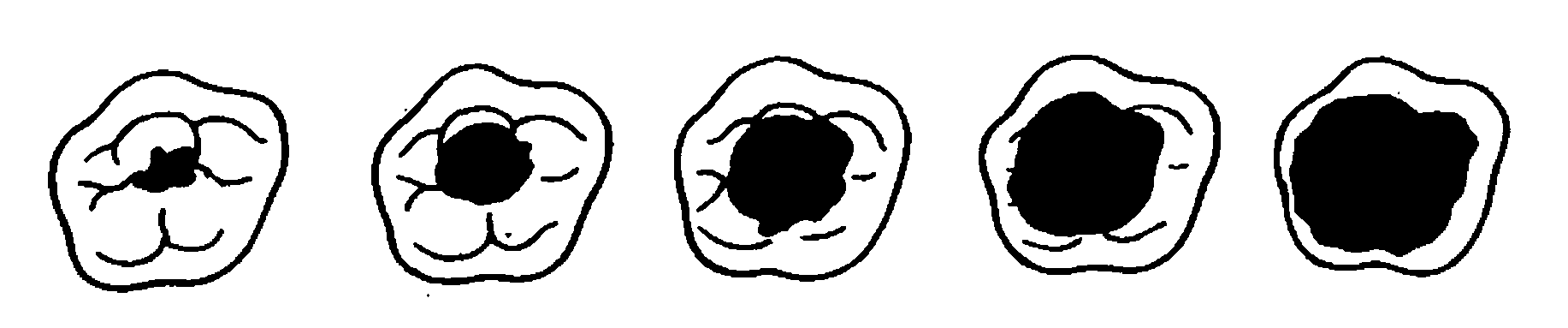 В первую очередь, как мы упоминали ранее, оценка степени поражения должна быть проведена только после иссечения всех размягченных тканей, нависающих краев эмали и формирования полости в соответствии с закономерностями распределения жевательного давления, падающего на оставшиеся ткани и пломбировочный материал, а также взаимодействия стенхи зуба — пломба (вкладка).