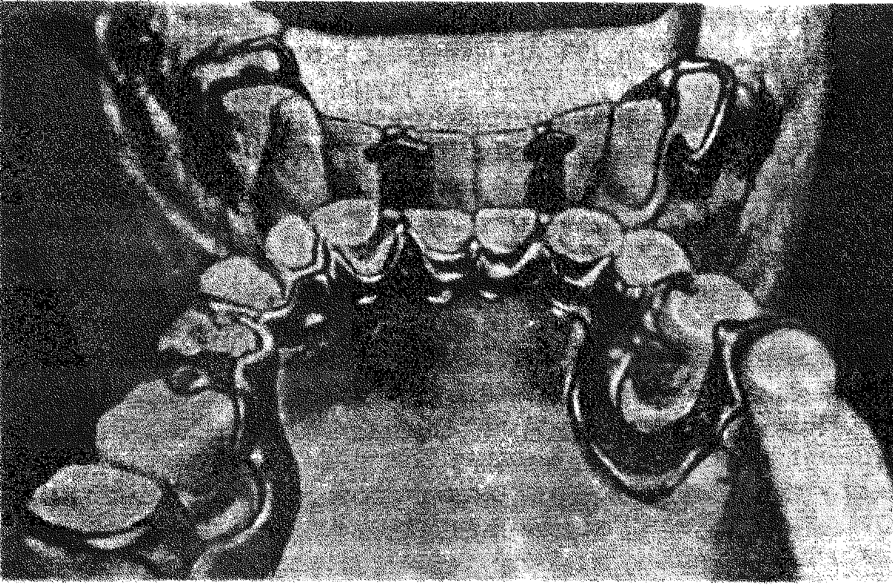 мес изготовлен мостовидный протез с опорными коронками иа 8 5 4| зубы. Приблизительно через год мостовидный протез стал подвижен, в области десневого края постоянно отмечалось воспаление, которое ие исчезало после различных терапевтических процедур.