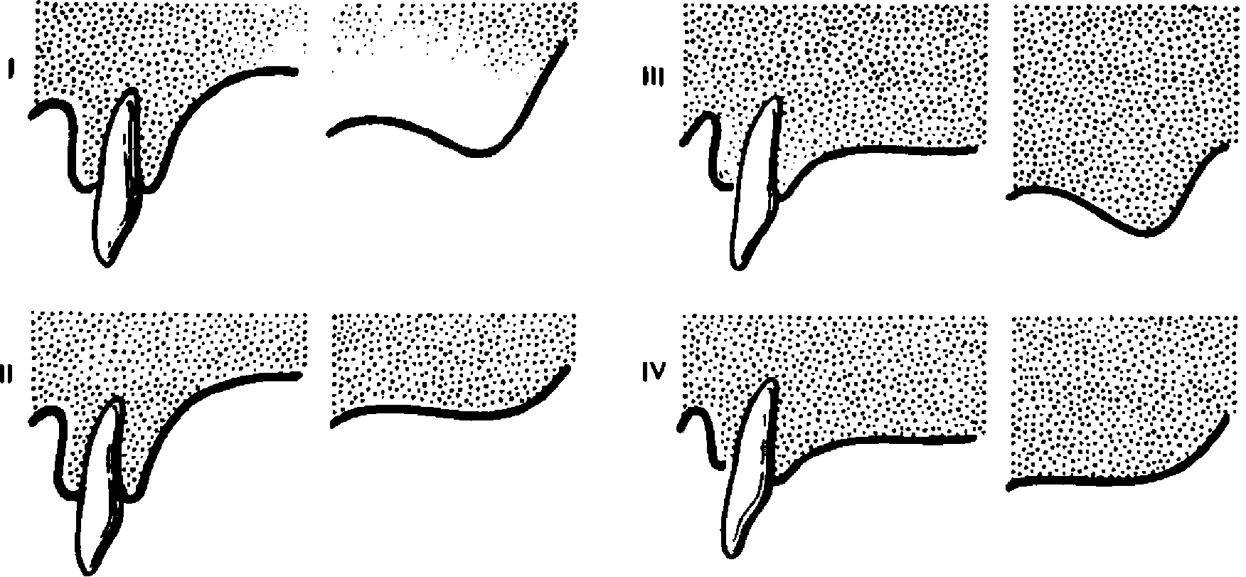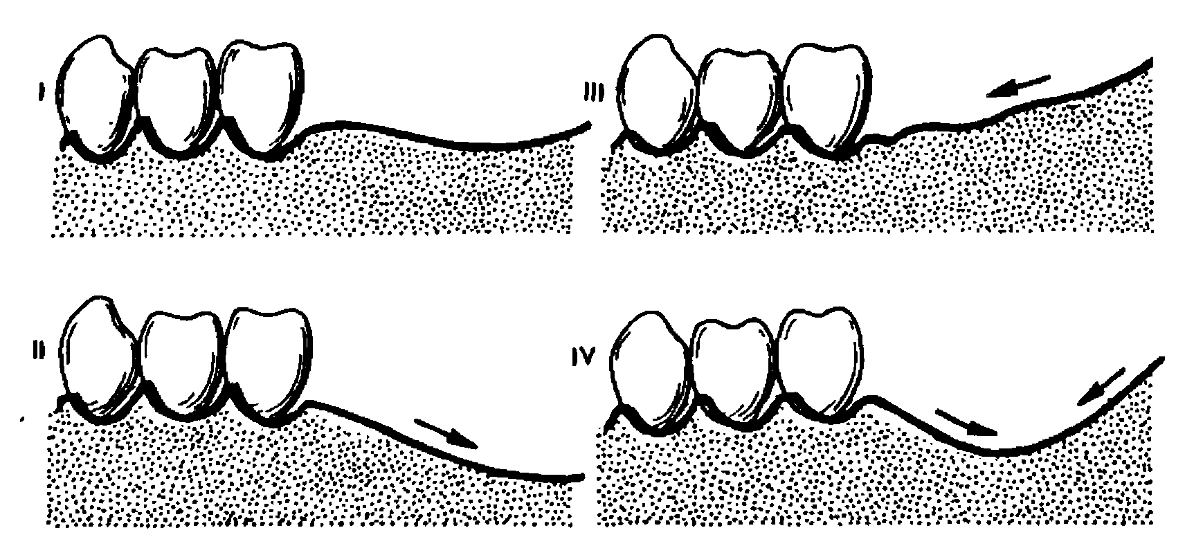 При отсутствии жевательных зубов на нижней челюсти Эльбрехт выделяет четыре типа беззубой альвеолярной части челюсти в боковых участках. Наиболее неблагоприятными являются I и III типы, когда возможен сдвиг протеза в заднем или переднем направлении, при нагружении седловидной части. Однако наряду с движением в этих направлениях обязательны микроэкскурсии протеза в боковых и вертикальных направлениях (рнс. 18). Амплитуда этих движений зависит не только от выраженности альвеолярного отростка, но и от степени податливости слизистой оболочки протезного ложа.