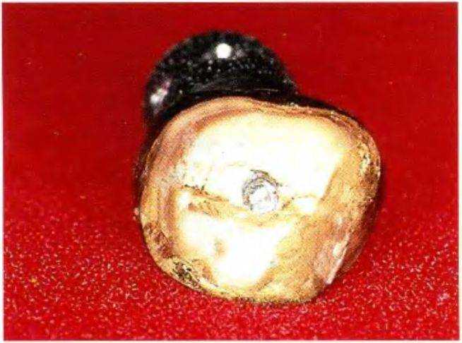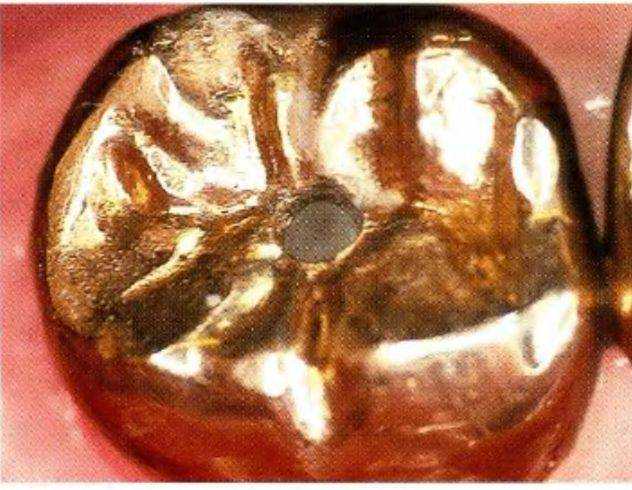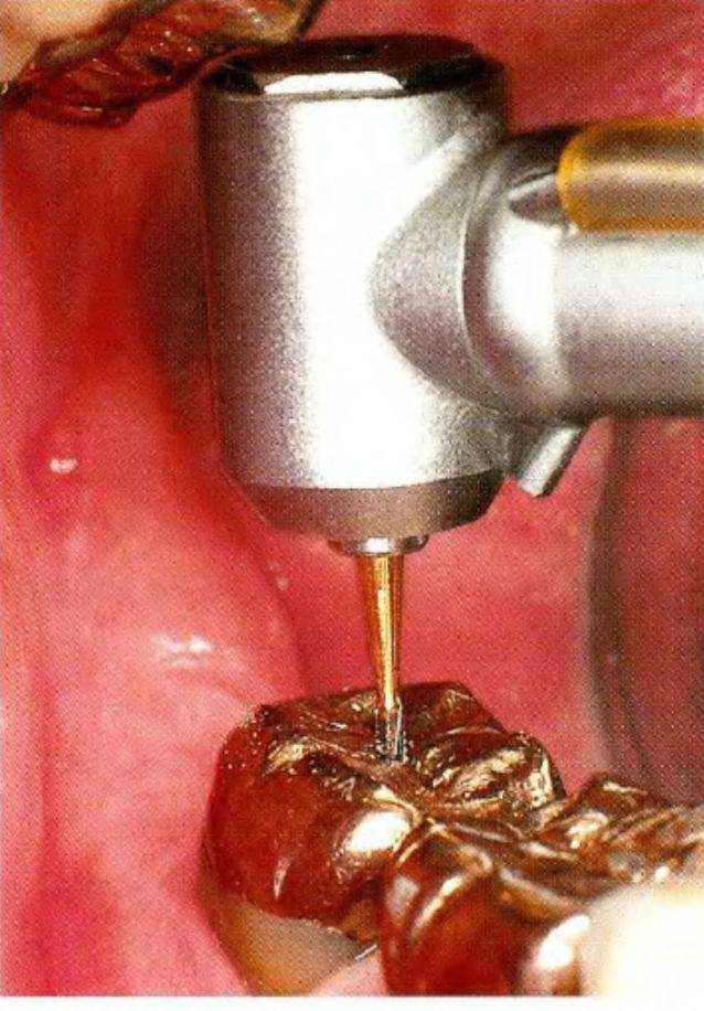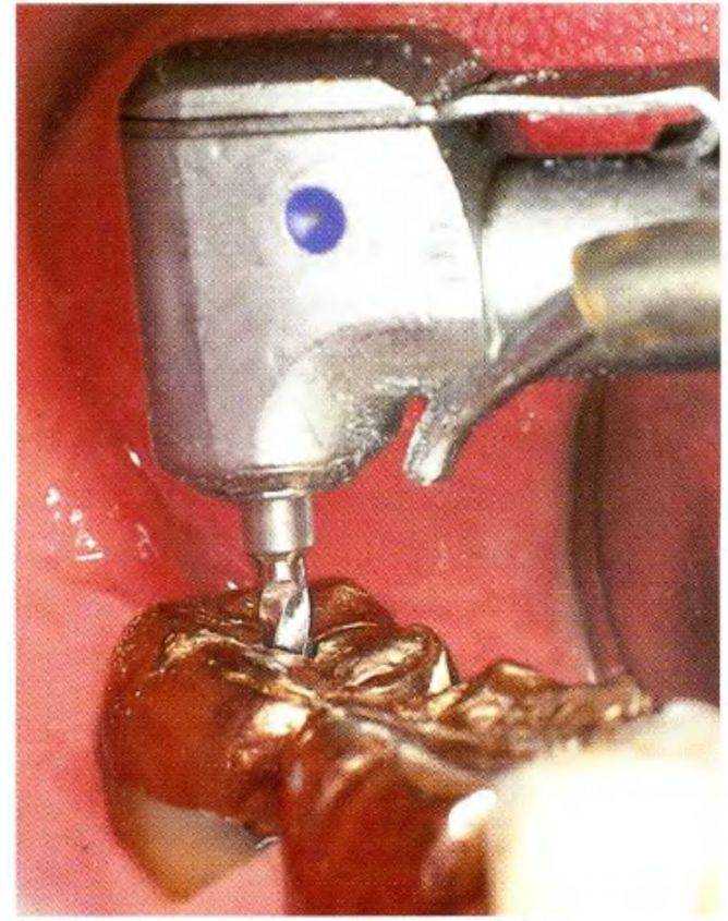 Рис. 1-2Ь. Препарирование доступа на окклюзионной поверхности золотой коронки с помощью твердосплавного бора