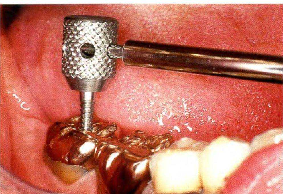 В данной клинической ситуации отделяющий болт системы Краун Лифт ввинчивали в центральную полость в коронке нижнего правого второго моляра. Такой болт сам нарезает для себя резьбу в толще золота. Отделяющий болт ввинчивают до достижения надежной фиксации. Специальный рычаг вводят в отверстие на ручке отделяющего болта и начинают снимать коронку (рис. 1-2е). Завинчивание проводят медленно и очень аккуратно, надавливая на болт сверху пальцем свободной руки во избежание оказывания на коронку бокового усилия. Состояние краев коронки оценивают с помощью бинокуляров. В момент отделения краев коронки от культи ввинчивание болта прекращают и извлекают его вместе с коронкой раскачивающими движениями (рис. 1-2f и 1-2д).