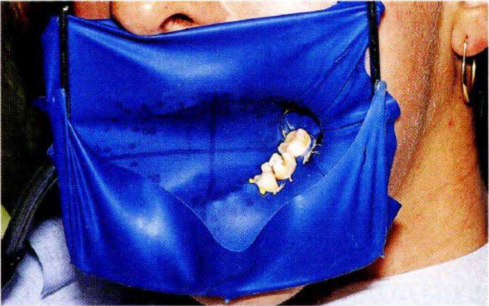 После прибытия пациента в стоматологическую клинику проводят проверку витальности препарированных зубов. Рекомендуется использовать проводниковую анестезию, поскольку адгезивные методики предполагают частое осушение струей холодного воздуха и обильную ирригацию. Провизорные реставрации снимают и устанавливают коффердам (как было описано выше). Препарированные полости подвергают механической чистке с помощью пескоструйной обработки, а затем проводят санацию химическими средствами и дезинфекцию тубулицидом (Tubulicid).