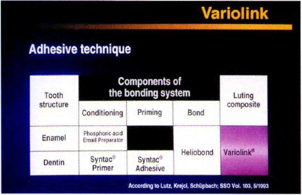 Адгезивная система (Ивокляр Вивадент): дентинный адгезив Синтак Классик (Syntac Classic); адгезивный цемент Вариолинк Ультра (Variolink Ultra); глицериновый гель для подавления кислорода (Liquid Strip glycerin gel); Фтор Протектор для фторирования (Fluor Protector). Безусловно многие компании производят качественные адгезивные системы, рекомендуется использовать химически однотипные системы. Материалы для протравливания и силанизации (Ультрадент; Ultradent): Ультра-Этч для протравливания эмали и дентина; силан; ретракционные нити Ультрапак (Ultrapak); материал для протравливания керамики (Porcelain Etch); гемостатическое средство Астрингедент (Astringedent).