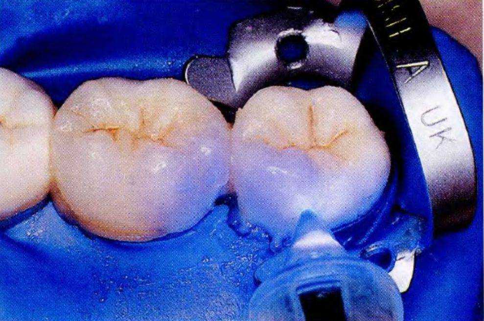 Рис. 2-24v. Фиксация вкладки кончиком насадки полимеризационной лампы на первом моляре нижней челюсти.