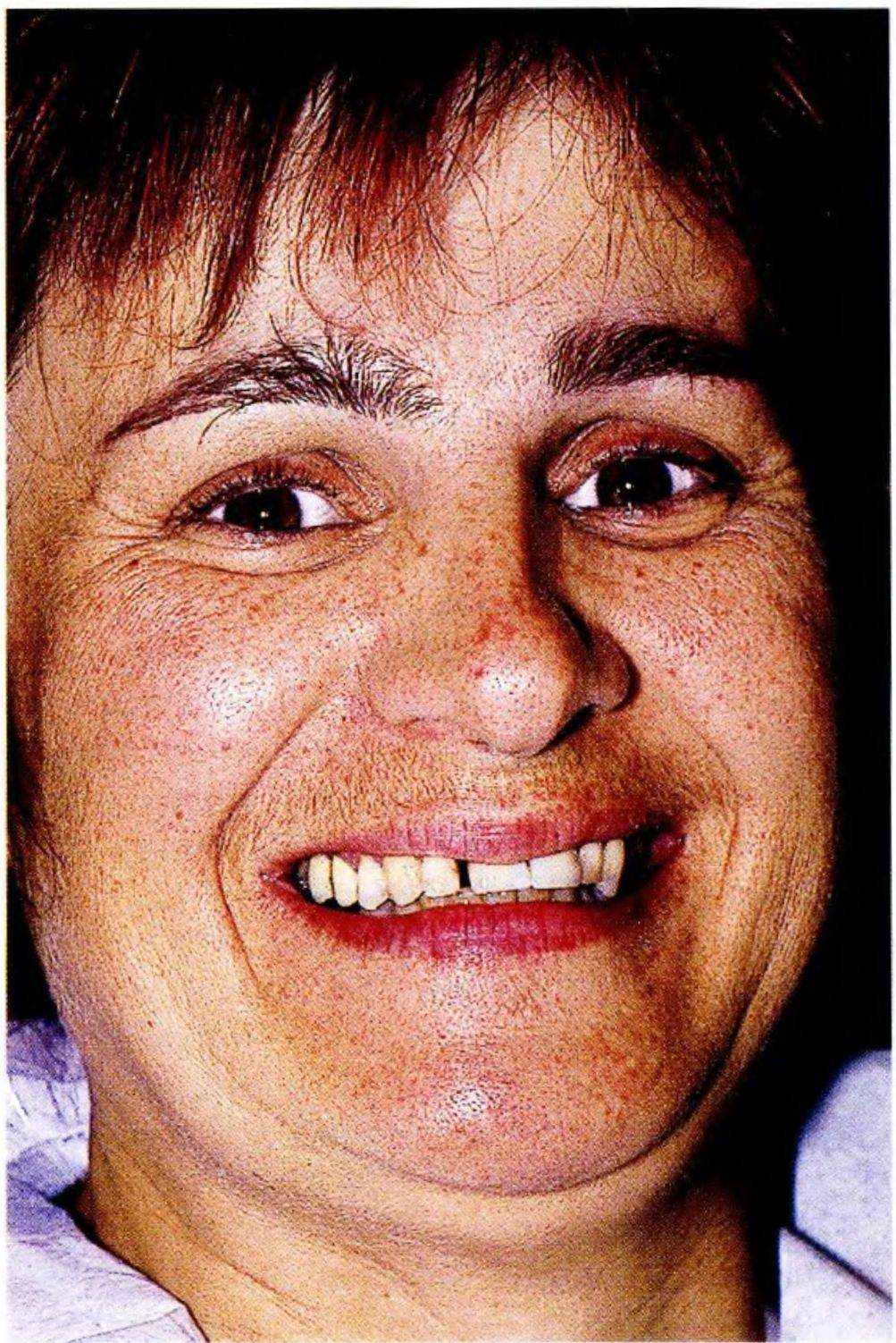 Рис. 2-25а. Пациентка недовольна состоянием своих зубов и видом улыбки фекта. Лечащий стоматолог, установивший коронки на оба верхние центральные резца, проинформировал ее о невозможности изменения ситуации и необходимости адаптации к состоянию (рис. с 2-25а по 2-2 5с).