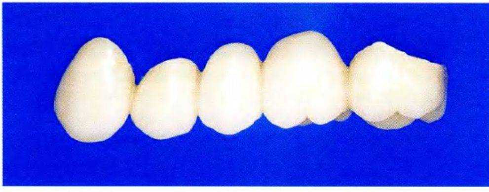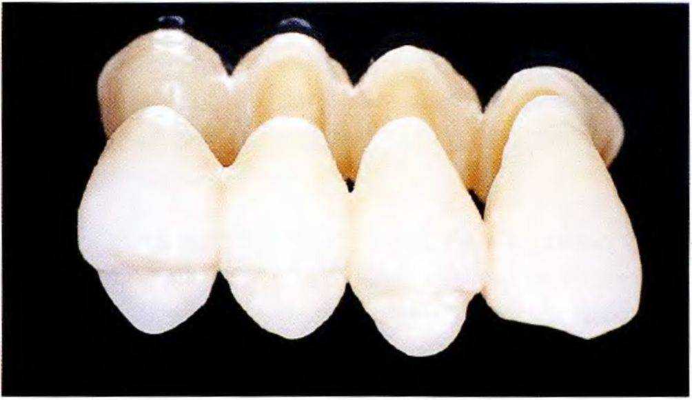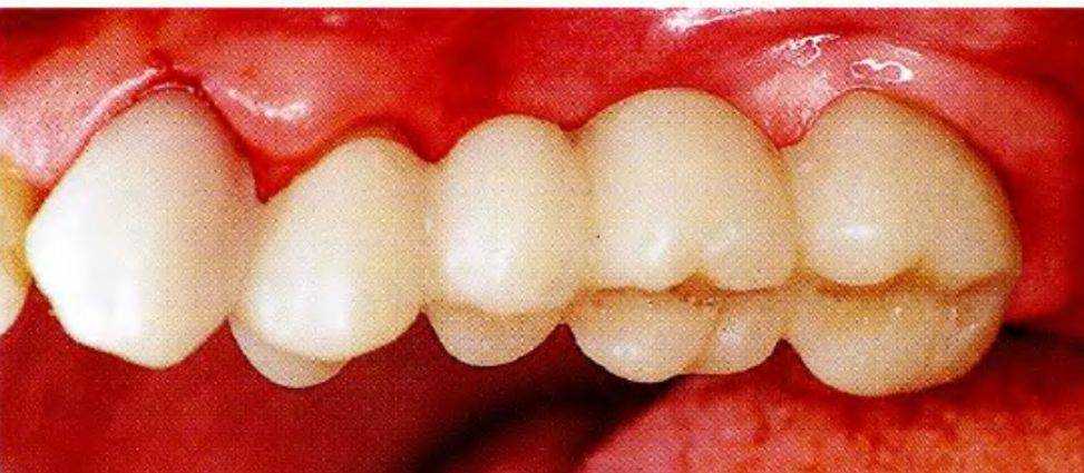 Рис. 3-32v. Вестибулярный вид провизорного мостовидного протеза после его фиксации в полости рта