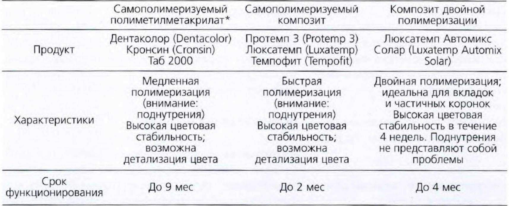 Набор Перфект-Пласт для быстрой лепки (Хагер и Веркен; Perfect-Plast Kit, Hager and Werken). Материалы для изготовления провизорных коронок и мостовидных протезов: Дентаколор (Хереус Кюльцер; Dentacolor, Heraeus Kulzer); Кронсин (Мерц Дентал; Cronsin, Merz Dental); Протемп 3 (ЗМ ЭСПЭ; Protemp 3