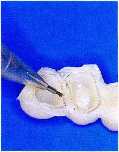 Под увеличением с помощью бинокуляров или стереомикроскопа края препарирования маркируют тон-