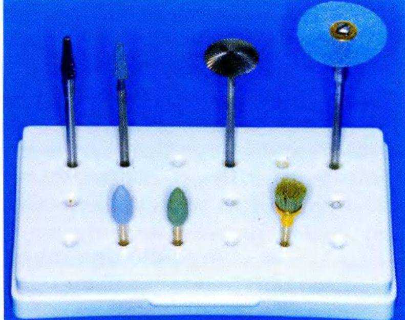 Рис. 3-32q (справа). Инструменты для проведения окончательной обработки, сошлифовывания и полирования. Задний ряд (слева направо): финишный бор с зубцами, расположенными в шахматном порядке; карборундовый камень; абразивный темный диск для интерпроксимальных промежутков; диск наждачной бумаги. Передний ряд (слева направо): два вида резиновых чашек и полировочная щеточка.