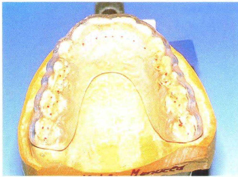 Через две недели пациентка констатировала отсутствие болей. Каппу модифицировали с помощью ФКК для создания передней направляющей. Правильный контур кривизны может быть определен с помощью: 1) анализа небного контура передних зубов (рис. 3-38h); 2) анализа дистального контура боковых зубов (последний определяется с помощью сагиттального распила модели челюсти через вершины опорных бугорков); 3) арифметического и геометрического анализа протрузионных данных аксиографии.