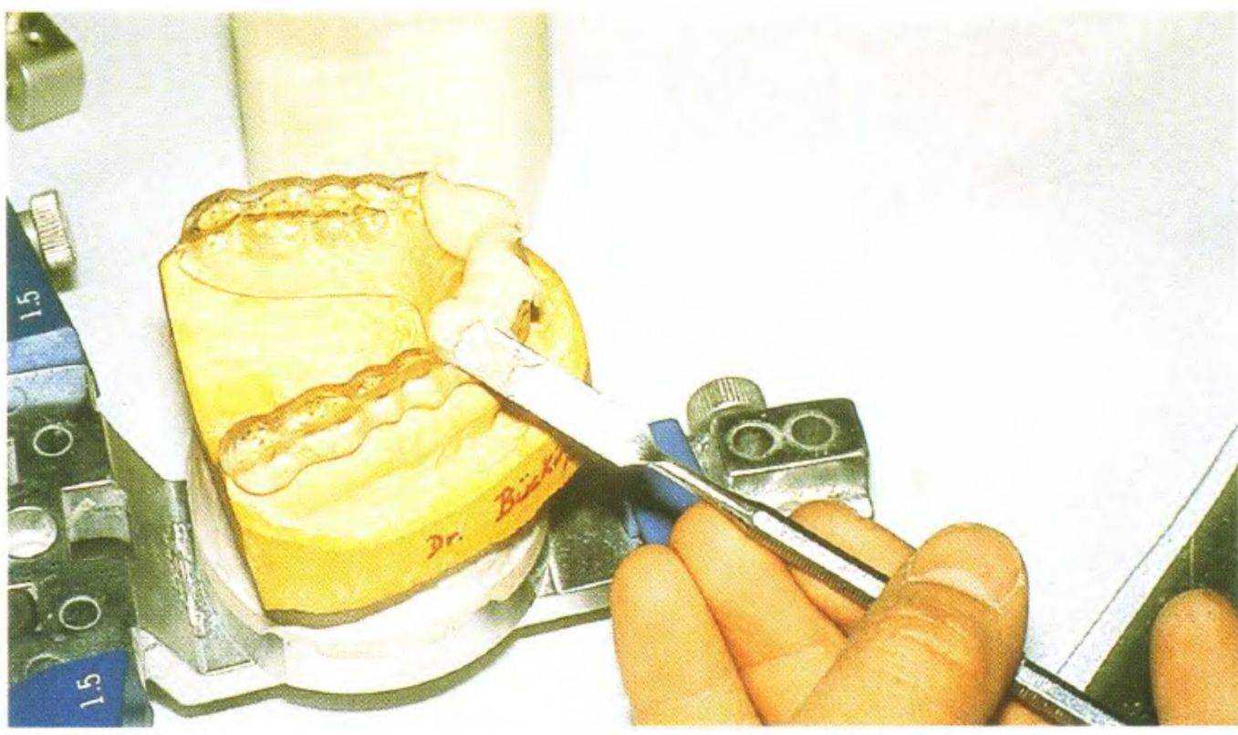 Формирователь контурных кривых (Contour Curve Former) д-ра Вольфрама Бюкинга. Пластмасса для изготовления провизорных коронок и несъемных частичных протезов Денталон Плюс (Хереус Кюльцер; Dentalon Plus, Heraeus Kulzer) или Снэп (Колтен Уэйлдент; Snap, Coltene Whaledent). Артикуляционная бумага Ханель (Колтен Уэйлдент). Термопластичные пластмассовые пластинки для вакуумных установок (Erkodent).
