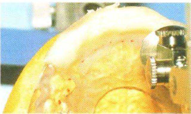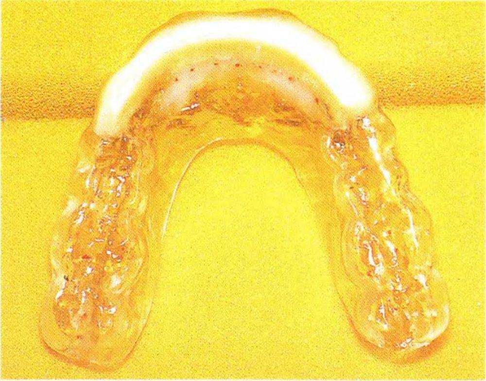 В данном случае сначала определили показатель а, который составил 4, затем подобрали оптимальный наконечник и установили его на ФКК (рис. 3-38о). После этого провели повторное избирательное пришлифование каппы и установили ее на модель в артикуляторе в центральном соотношении. Переднюю часть каппы обрезали вместе с плоскостью и очистили. Медленно затвердевающий бутилметакрилат (материал для изготовления временных коронок и мостовидных протезов) перемешали и нанесли на переднюю часть каппы и пальцами придали ему нужную форму (рис. 3-38р и 3-38q).