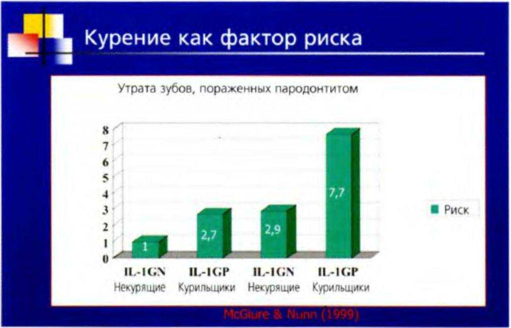 В последние годы подход к проведению пародонтологического лечения подвергся некоторым изменениям. В ряде исследований было показано, что пародонтит может быть обусловлен не только бактериями, но и генетической предраположенностью. Кроме того, известно, что курение усугубляет повреждение пародонта (рис. 4-5) и является одним из наиболее значимых факторов риска в пародонтологии и имплантологии (рис. 4-6).