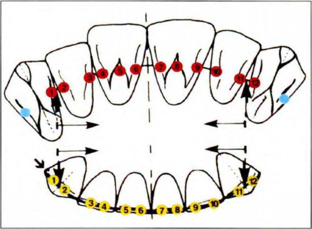 Рис. 5-2. Окклюзионные контакты в области передних зубов при наличии нормальной окклюзии. Окклюзионный свод показан от медиальной поверхности верхнего правого клыка до медиальной поверхности верхнего левого клыка. Дистальные половины клыков относятся к боковым сегментам