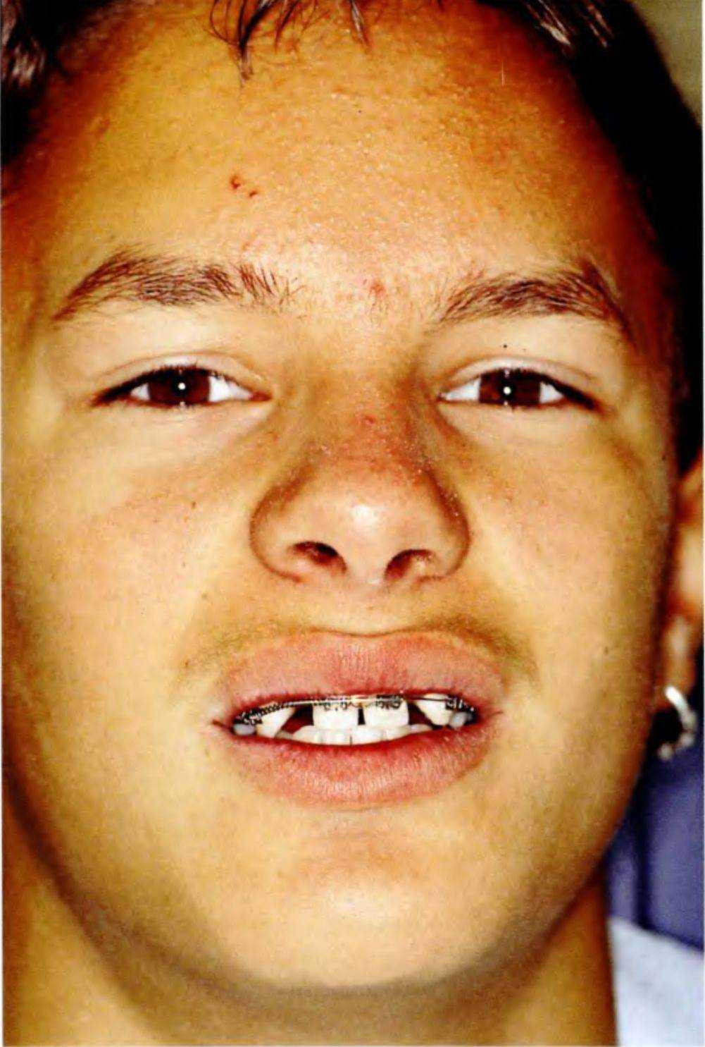 Рис. 5-За. Тринадцатилетний пациент с врожденным отсутствием боковых резцов верхней челюсти с помощью ортодонтических методов и последующее протезирование позволяют получить эстетически и функционально благоприятный долгосрочный результат. Таким образом достигается естественное положение клыков, оптимальное как с функциональной, так и с эстетической точки зрения. Только в нем они способны выполнять направляющую функцию при боковых и протрузионных движениях нижней челюсти. К передней группе зубов относится только медиальная часть клыка, дистальная часть относится к дистальной группе (рис. 5-2).