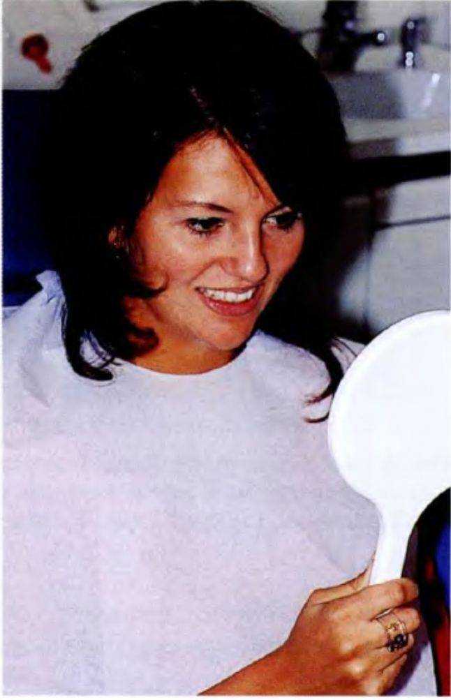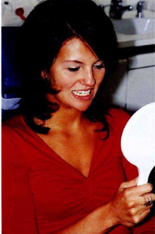 Человеческий глаз не в состоянии отличить один оттенок от другого при их наложении. Это аналогично музыке - только тренированное ухо может различить отдельные ноты при ударе по нескольким клавишам одновременно. Однако зрение подвержено оптическим иллюзиям. Таким образом, исключительно важно, чтобы при определении цвета зубов рядом с пациентом (или на нем) не было никаких ярких предметов. Яркая губная помада (рис. 6-25), броский макияж или одежда (рис. 6-26а), красочное окружение (обои, картины, растения и т.д.) мешают точному определению цвета. Если на пациенте яркая одежда, рекомендуется использовать накидку или салфетку нейтрального цвета, таким же нейтральным должен быть фон позади пациента (рис. 6-26Ь и 6-2 6с).