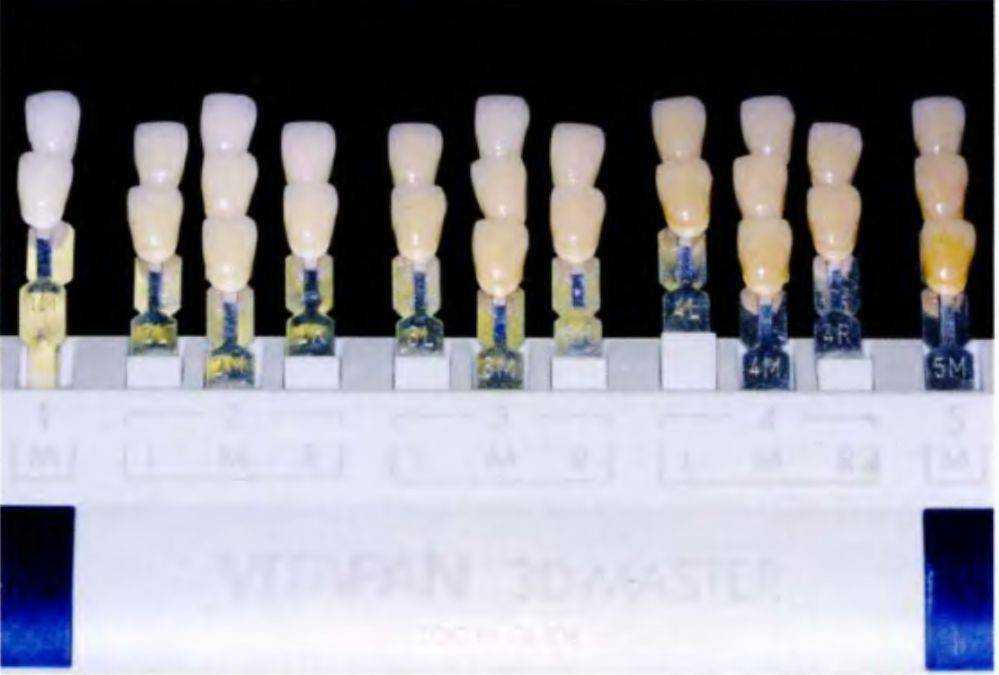 Образцы в шкале системы Вита Классик можно расположить так, чтобы оценивать цвет по яркости, оттенкам и интенсивности. В соответствии с данными Henning,
