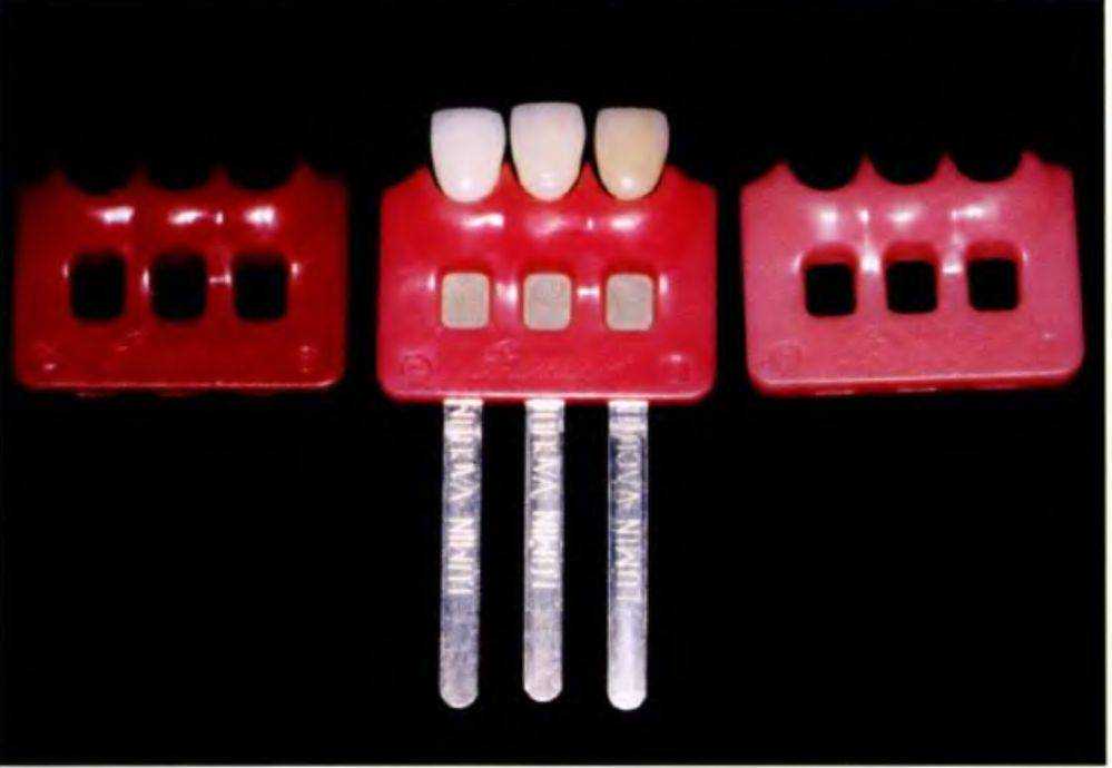Из набора подбирают образец и поворачивают его так, чтобы сопоставить с зубом «край в край». Это позволяет расположить образец в одной оптической плоскости с зубом (рис. 6-ЗЗИ).