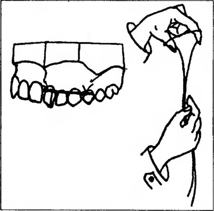 Нитяную петлю накладывают на перемещаемый зуб, оборачивают вокруг него по ходу предполагаемого поворота. К ней крепят резиновое кольцо, которое дополнительной ниткой фиксируется на опорном зубе.