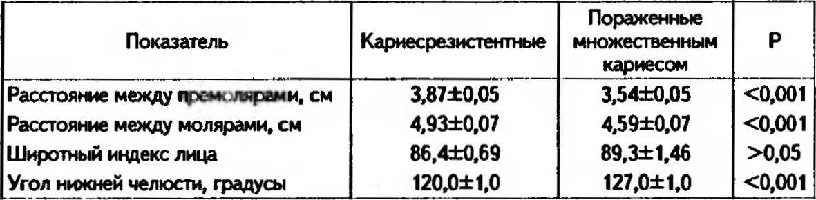 Расстояние между премолярами и молярами, широтный индекс лица и величина угла нижней челюсти у лиц с кариесрезистентными зубами и при поражении зубов множественным кариесом
