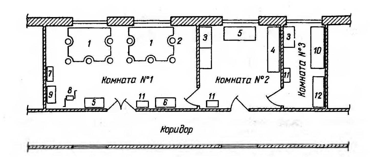 / — рабочий стол; 2 — стул (винтовой); 3 — вытяжной шкаф; 4— гипсовочная установка; 5 — стол для формовки; б — шкаф; 7 — аппараты для протягивания гильз (на тумбе); 8 — вальцы, 9 — пресс; 10 — полировочная установка; П — раковина; 12 — ящик для гипса.