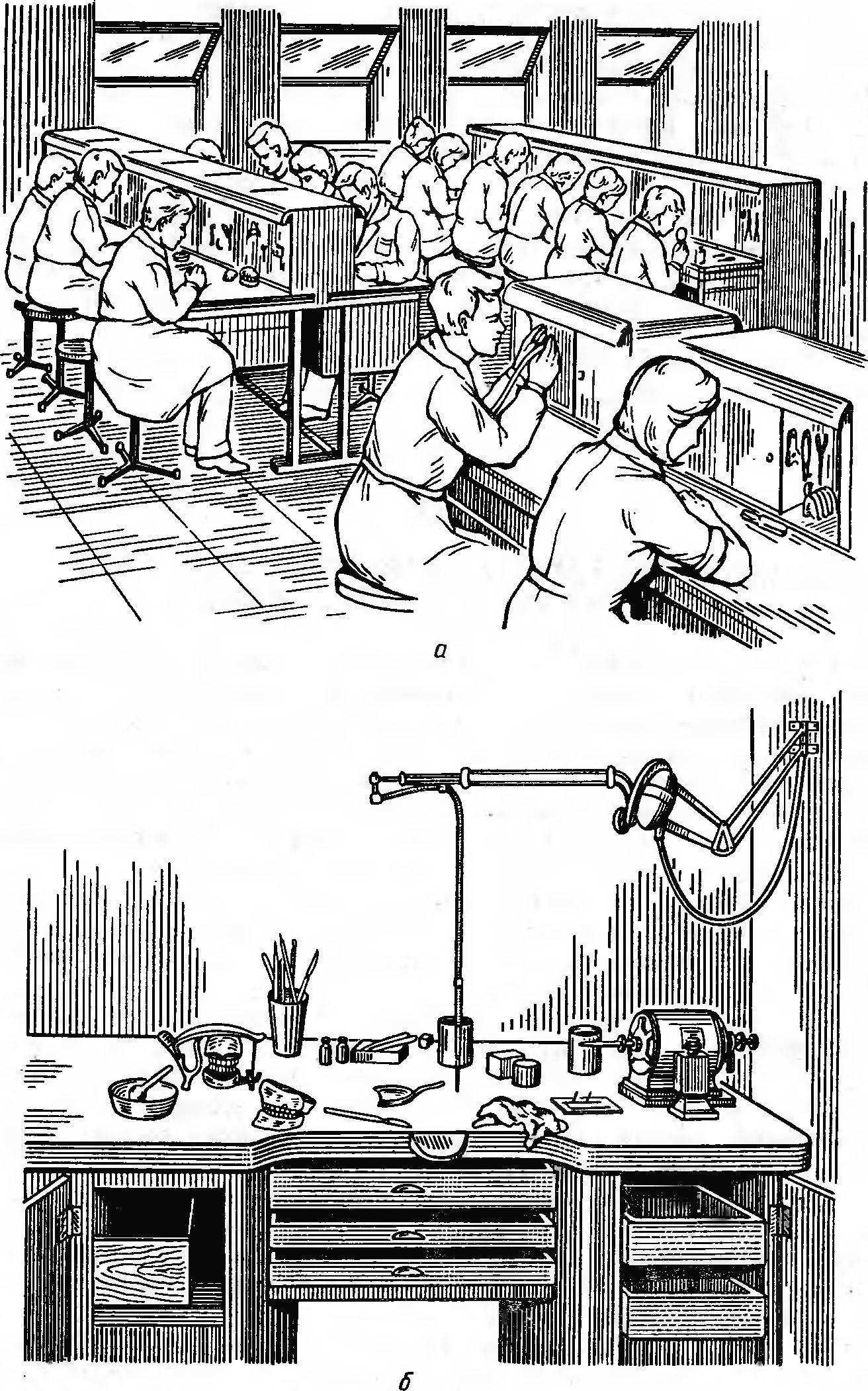 Удобному, быстрому и наиболее эффективному выполнению всех процессов, связанных с изготовлением протезов, способствует специально оборудованное индивидуальное рабочее место, состоящее из лабораторного стола высотой 75—80 см и вращающегося стула со спинкой. Высота стола, стула, наклон и высота спинки регулируются индивидуально (рис. 2, о).