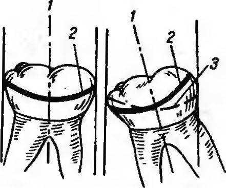 / — продольная ось зуба; 2 — анатомический экватор; 3 — клинический экватор.