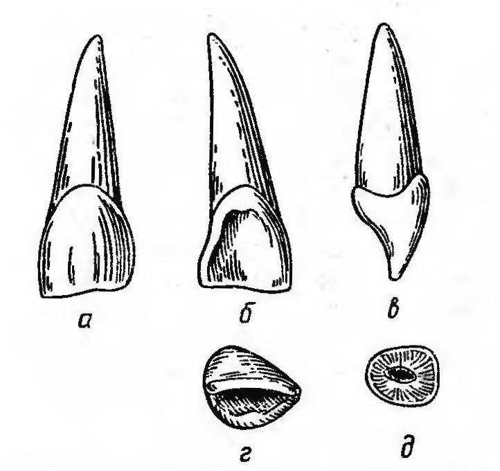 а — вестибулярная поверхность; 6 — язычная поверхность; в — апроксимальная поверхность; г — режущая поверхность; д— контур среза на уровней шейки зуба.