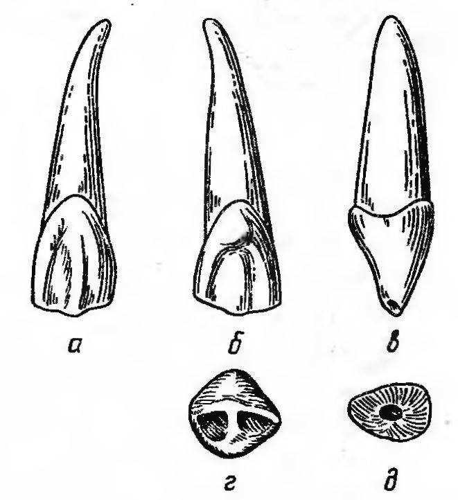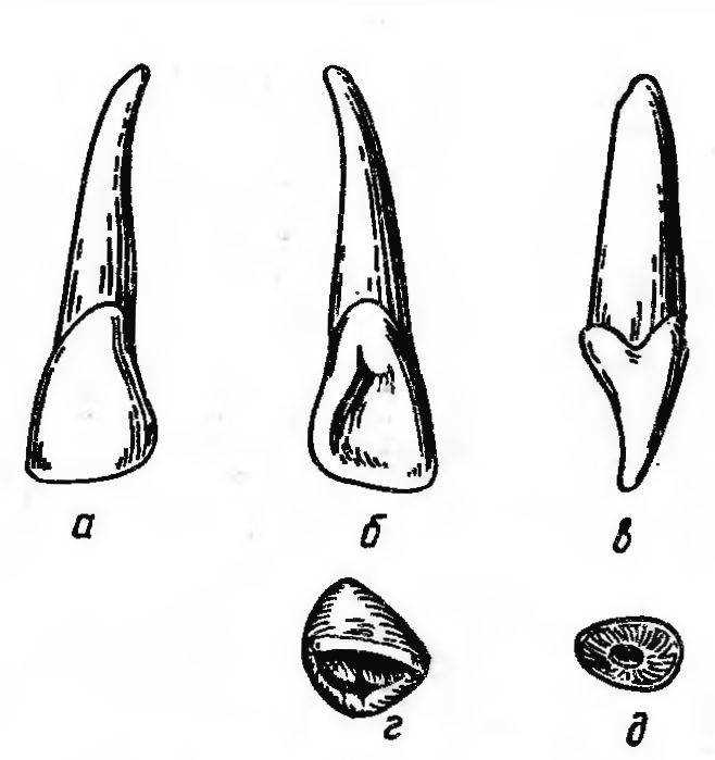 ную части. Между валиком и боковыми контурами почти как у резцов имеются два вертикально идущих углубления (борозды). Ближе к режущему краю они углубляются. Таким образом, признаки угла кривизны и режущего края у коронки клыков выражены хорошо.