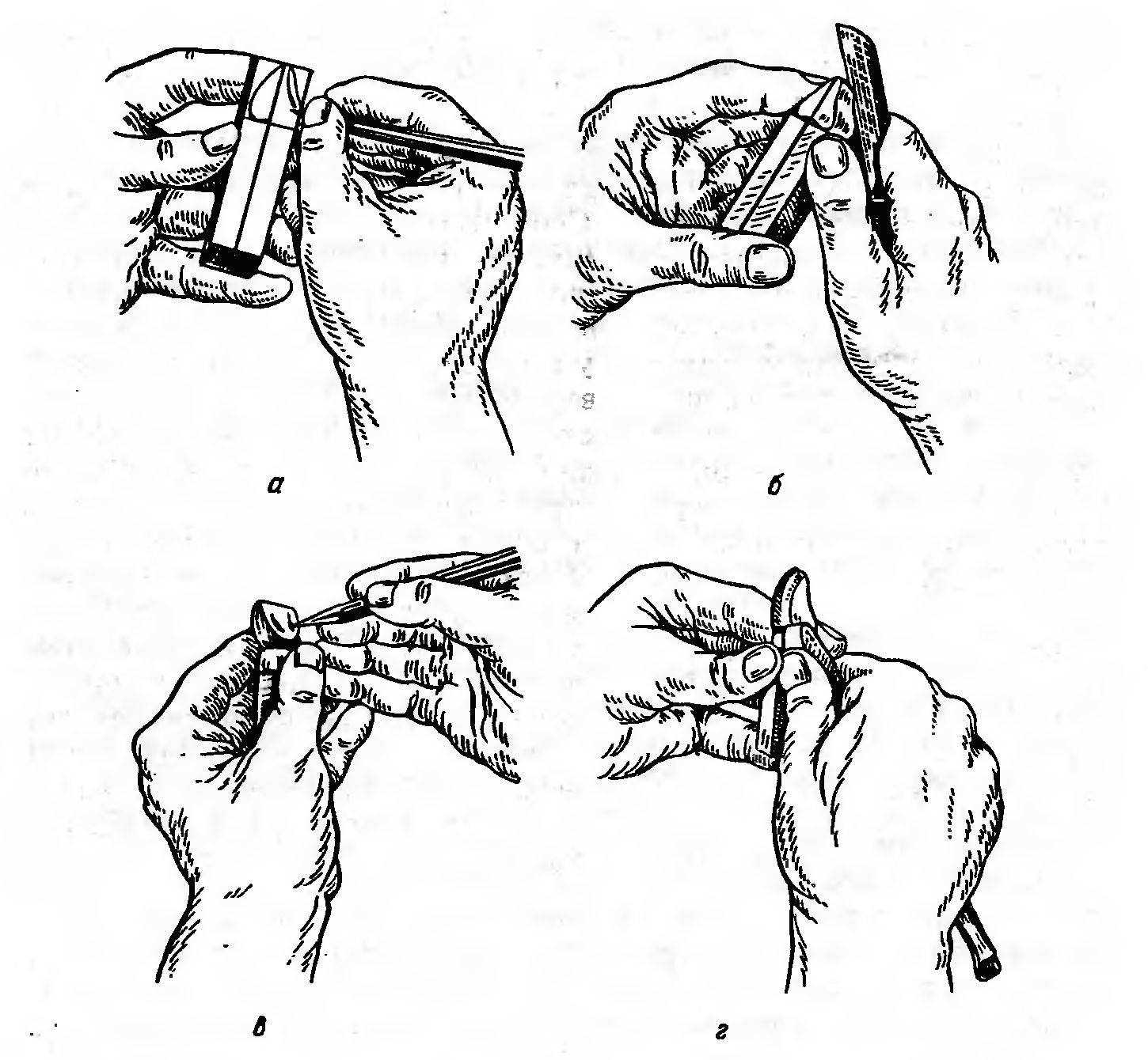 предполагаемого зуба и на этой же стороне, а затем на противоположной вычерчивают схему боковой поверхности коронки резца, исходя из типичного для него соотношения ширины к длине 1:1,25 (рис. 17, а, б). После этого гипсовым ножом срезают излишки гипса соответственно схеме, чтобы гипс легко поддавался обработке, столбик следует предварительно хорошо пропитать водой. В результате на столбике образуется клиновидная уплощенная вершина. На этом клине намечают небную поверхность в виде треугольника с овальной вершиной, направленной к будущей шейке зуба, и соответственно рисунку удаляют излишки гипса. Затем приступают к созданию губной поверхности, которая имеет форму прямоугольника. Карандашом наносят вертикальную линию, делящую коронку на медиальную и дистальную части, по сторонам которой вычерчивают образования треугольной формы с закругленными к шейке вершинами, соответствующие вестибулярным углублениям.