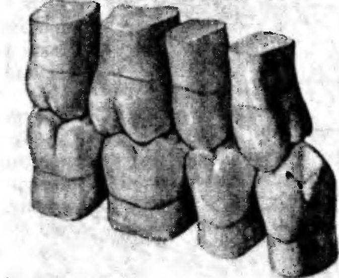 Рис. 30. Соотношение окклюзионных поверхностей жевательных зубов при ортогнатии (вид с язычной стороны).