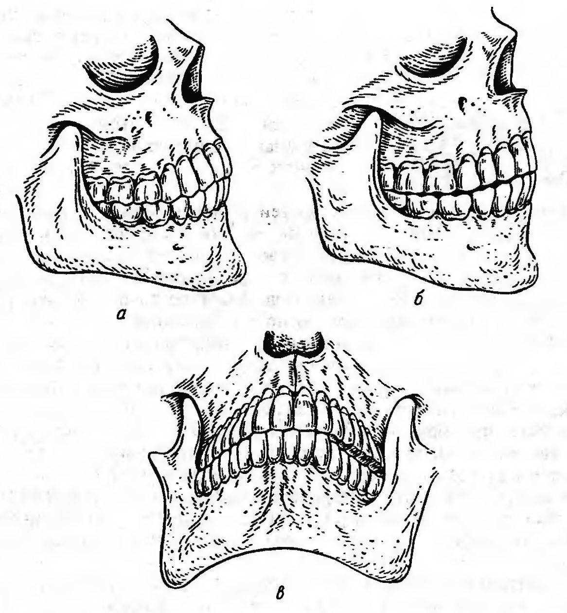Рис. 32. Соотношение зубных рядов в центральной (а), передней (б) и боковой (в) окклюзиях.