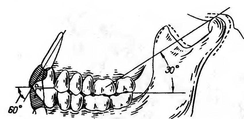 резцы нижней челюсти скользят без отклонения в стороны — срединные линии между центральными резцами совпадают. Путь перемещения резцов нижней челюсти вперед называется сагиттальным резцовым путем. Величина его зависит от степени перекрытия зубов нижней челюсти зубами верхнего ряда (рис. 33): чем больше перекрытие, тем больше смещается нижняя челюсть вперед и вниз до установления контакта между режущими поверхностями резцов, а также от строения суставов. Смещение резцов нижней челюсти идет по плоскости небных поверхностей, которая наклонена к окклюзионной (протетической) плоскости под углом 40—50°. Величина угла, сагиттального разцового пути индивидуальна и зависит от наклона продольных осей резцов верхней челюсти. Этот путь и угол отсутствуют у лиц, имеющих прямой прикус. Для откусывания у этой группы лиц нижняя челюсть опускается на величину пищевого комка.
