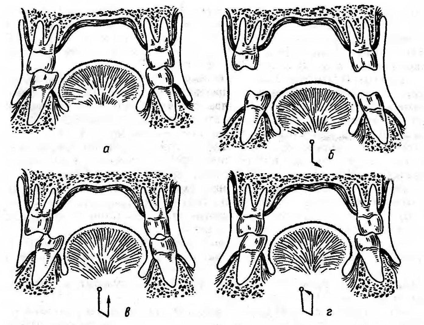 а. г — положение в центральной окклюзии; 6 — смещение вниз и влево; в — левая боковая окклюзия.
