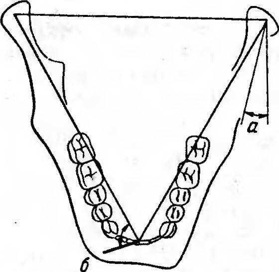 Рис. 35. Угол суставного (а) и резцового (б) боковых путей при перемещении нижней челюсти вправо.