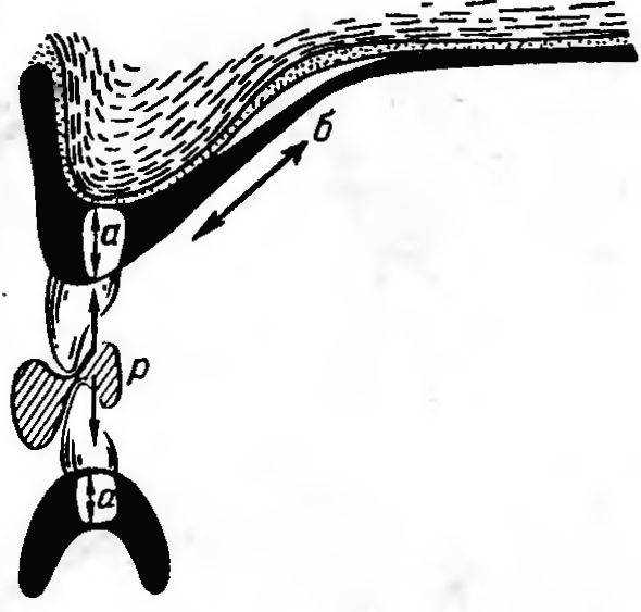 о — зона сжатия; 6 — зоны растяжения и изгиба; е — зоны отрыва; Р — нагрузка.