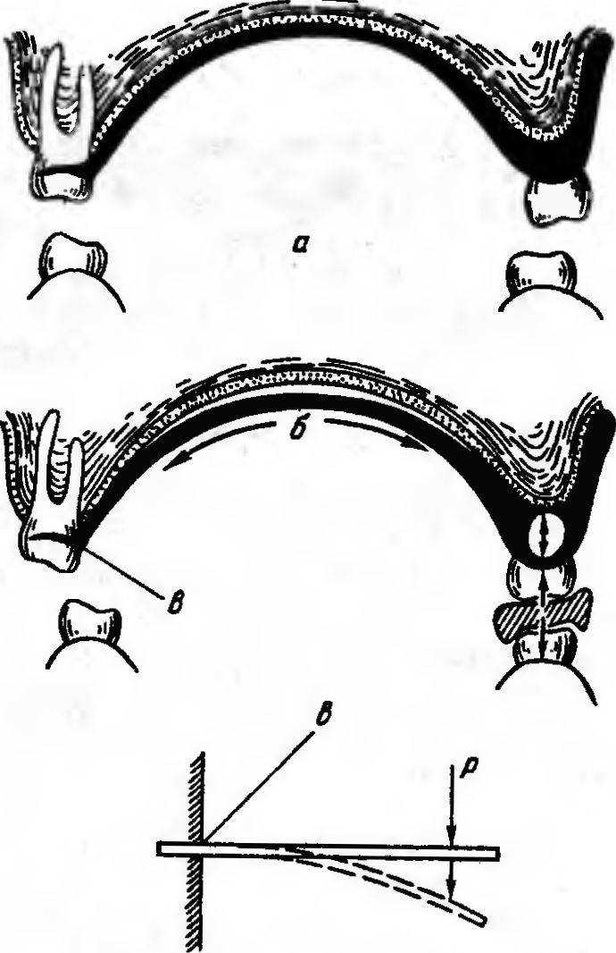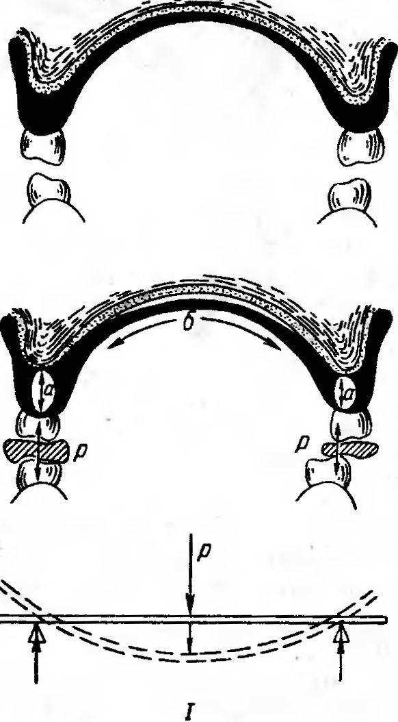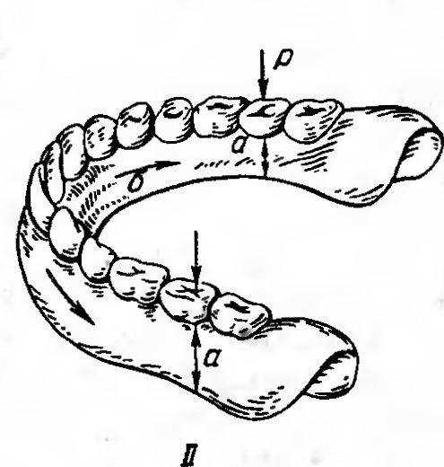 В различные фазы жевания: откусывание, раздавливание и растирание пищи—силы сокращения жевательной мускулатуры действуют на протез в различных направлениях. Направление этих сил меняется во времени, при этом соответственно быстро изменяется расположение возникающих в протезах зон напряжения. При откусывании пищи протезом на беззубой челюсти его фронтальный участок (зубы и базис), находящийся непосредственно под пищевым комком, испытывает нагрузку на сжатие (рис. 44). Одновременно в других участках базиса возникают напряжения, характерные при нагрузке на растяжение и изгиб. Такой характер напряжений обусловлен направлением сил жевательного давления не строго вертикально, а под некоторым углом. На растяжение работает ближайший от места закрепления зубов фронтальный участок базиса, на который не попадает пищевой комок. По линии клыков или первых премоляров базис испытывает напряжение на изгиб. Изгибающий момент вызван силой, приложенной к фронтальному участку протеза при закрепленном дистальном участке и зависит от степени податливости слизистой оболочки.