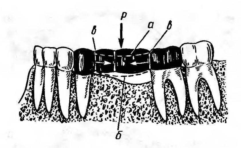 Рис. 46. Зоны напряжения в протезе при наличии естественных зубов.