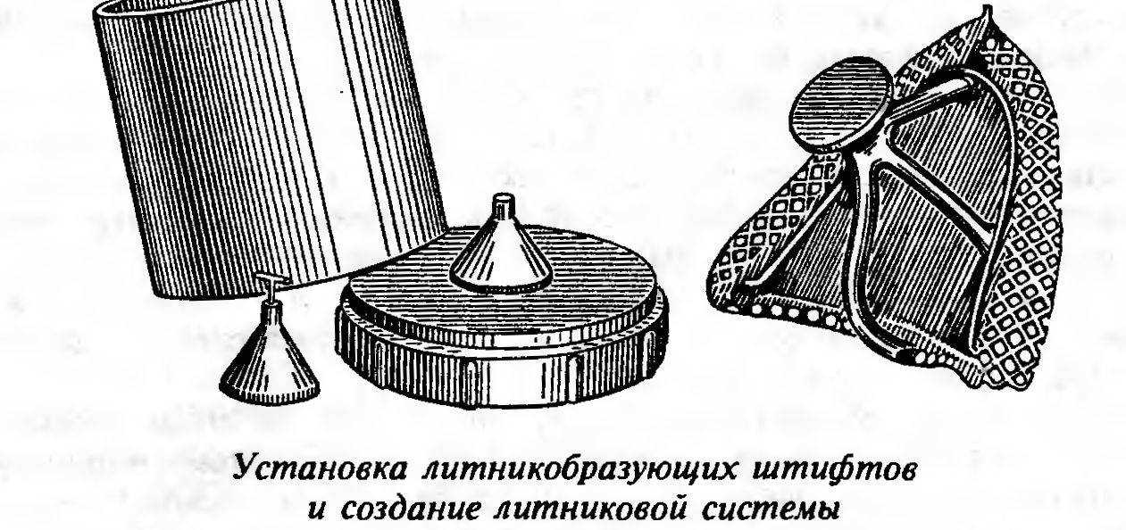 При всех способах литья в литейной форме, кроме формы металлической отливки, предусматривается и литниковая система, представляющая собой каналы, по которым жидкий металл подводится к отливке. Литниковая система создается путем подвода к восковой детали литникобразующих штифтов. Эти штифты могут быть металлическими и восковыми или металлическими, дополнительными восковыми.