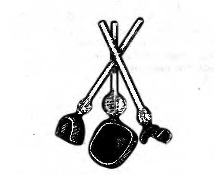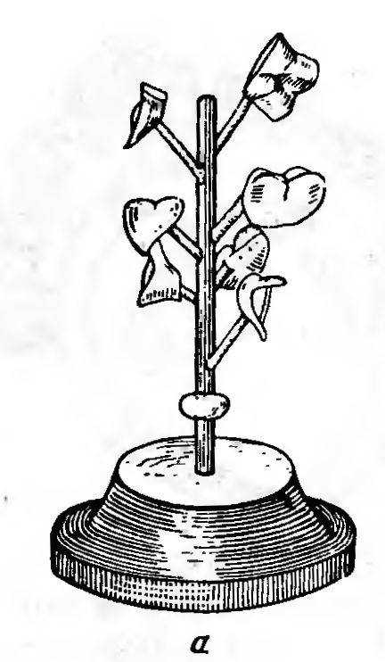 образом: на центральный металлический штифт диаметром 3—4 мм в разных направлениях «елочкой» приклеивают восковые штифты диаметром 1,5—2,0 мм и длиной 0,5 см, затем к каждому восковому штифту подводят смоделированную деталь и слабо разогретым шпателем, расплавляя воск штифта (а не модели), приклеивают к восковому штифту (рис. 52).