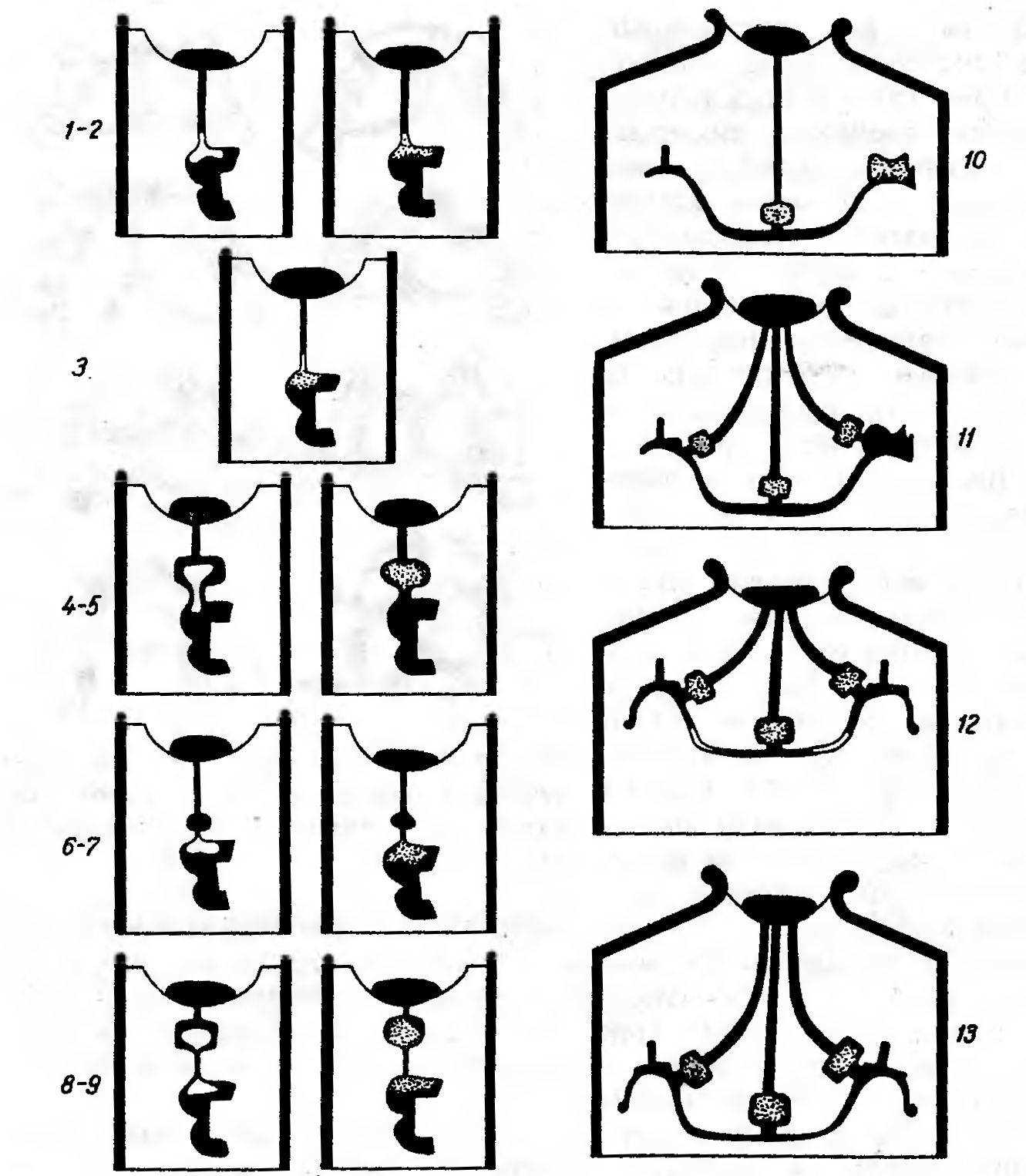 Рис. 53. Взаимоотношение литникобразующих штифтов с восковой композицией, разной по толщине и значительной по протяженности.