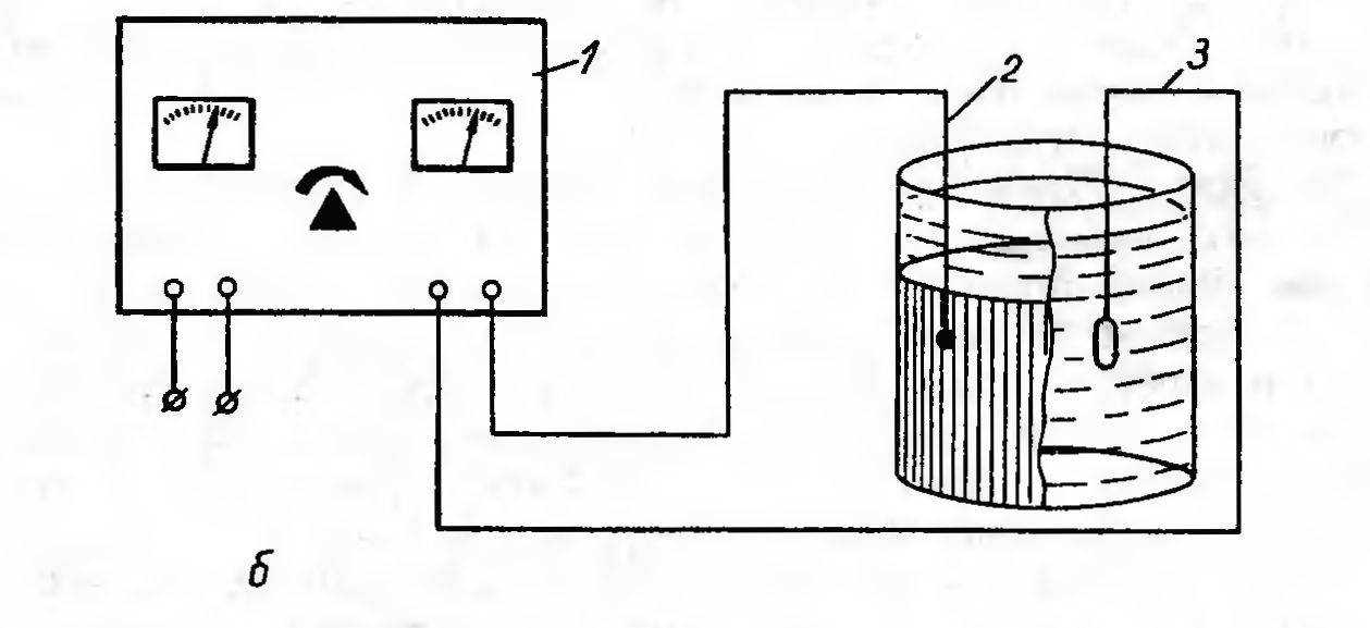 Рис. 60. Пескоструйный аппарат (а) и схема аппарата для электрополировки (б). 1 — выпрямитель; 2 — катод; 3 — анод.