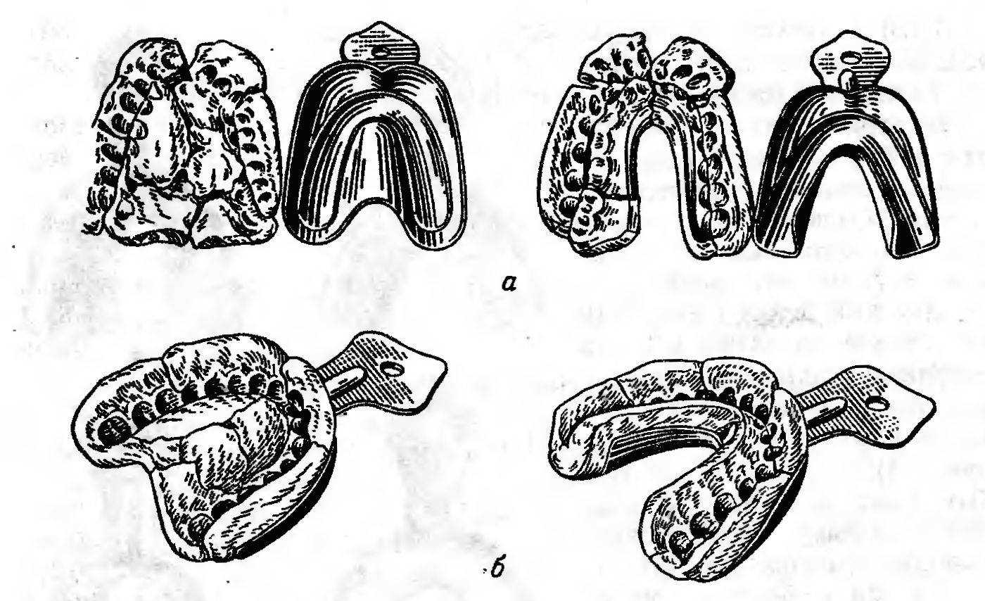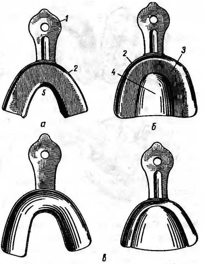 а — для нижней челюсти; б — для верхней челюсти; «— лля получения слепков с буззубых нижней (слева) и верхней (справа) челюстей; I — ручка; 2 — борта; 3 — ложе для зубов; 4 — свод; J — вырез для языка.