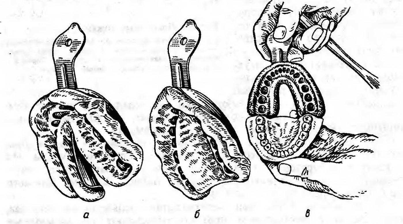 а — с нижней челюсти; 6 — с верхней челюсти; в — освобождение слепка после отливки модели.